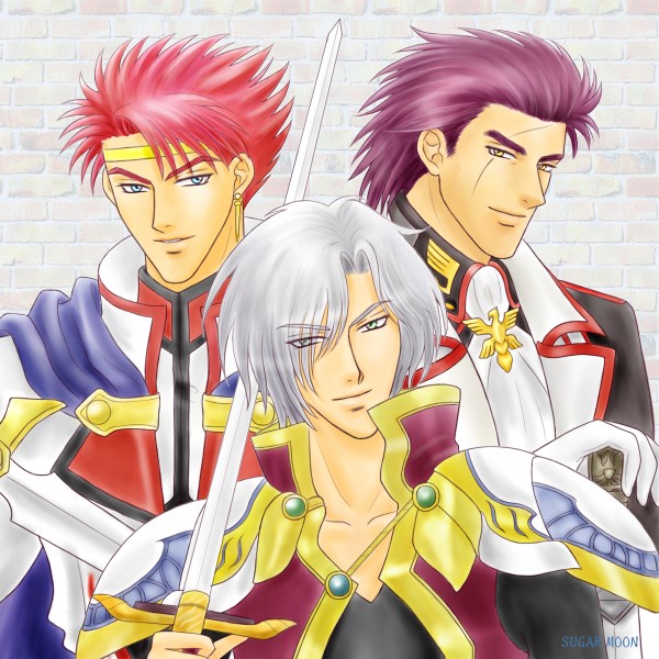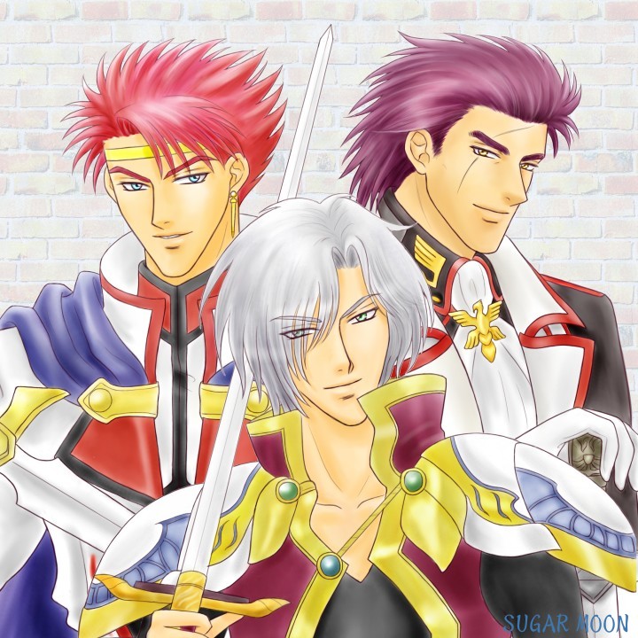 Sugar Moon > gallery > アンジェ > 2周年記念 2周年記念 ~壁紙配布~ 大きくご覧になれます。 120Kb(600*600) 150Kb(720*720) サイト2周年用に描いたものです。 ずっと前から騎士3人衆?を描くのが夢でした。